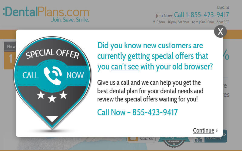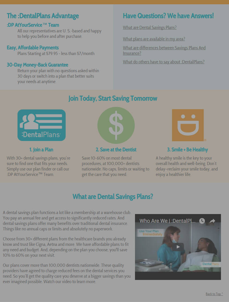 Savings plans are NOT insurance and the savings will vary by provider, plan and zip code. These plans are not considered to be qualified health plans under the Affordable Care Act. Please consult with the respective plan detail page for additional plan terms. The discounts are available through participating healthcare providers only. To check that your provider participates, visit our website or call us. Since there is no paperwork or reimbursement, you must pay for the service at the time it’s provided. You will receive the discount off the provider’s usual and customary fees when you pay. We encourage you to check with your participating provider prior to beginning treatment. Special promotions including, but not limited to, additional months free are not available to California residents or on Fully Insured Plans. Note – not all plans and offers available in all markets. © 1999-2015 DentalPlans.com, Inc. All Rights Reserved. Patents Pending |